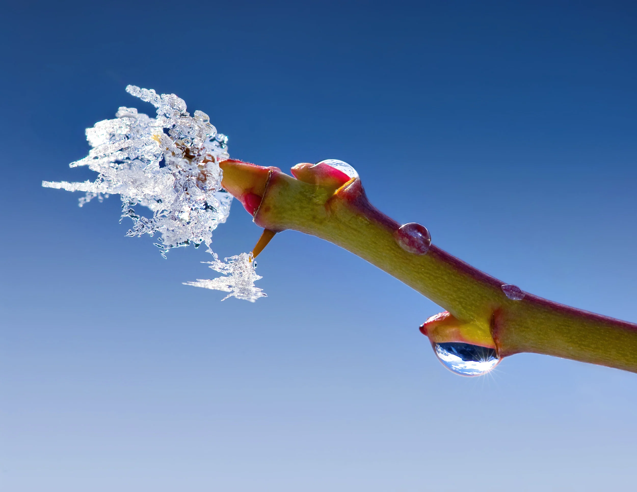Alcune gocce di rugiada congelate si stavano sciogliendo sotto il sole su questo rametto di rosa selvatica. Ho notato subito che lo sfondo qui era molto lontano ed era abbastanza insolito: la superficie ghiacciata di un lago (lago di Tovel). Con uno sfondo così lontano ho potuto utilizzare un diaframma piuttosto chiuso, f / 16, per ottenere tutto il rametto a fuoco e lo sfondo completamento sfuocato, dalle bellissime sfumature blu. Inoltre, il diaframma così chiuso avrebbe creato una stella a 18 punte (stavo usando un obiettivo con un diaframma a 9 lamelle) sul punto di luce del riflesso del sole dentro la goccia.